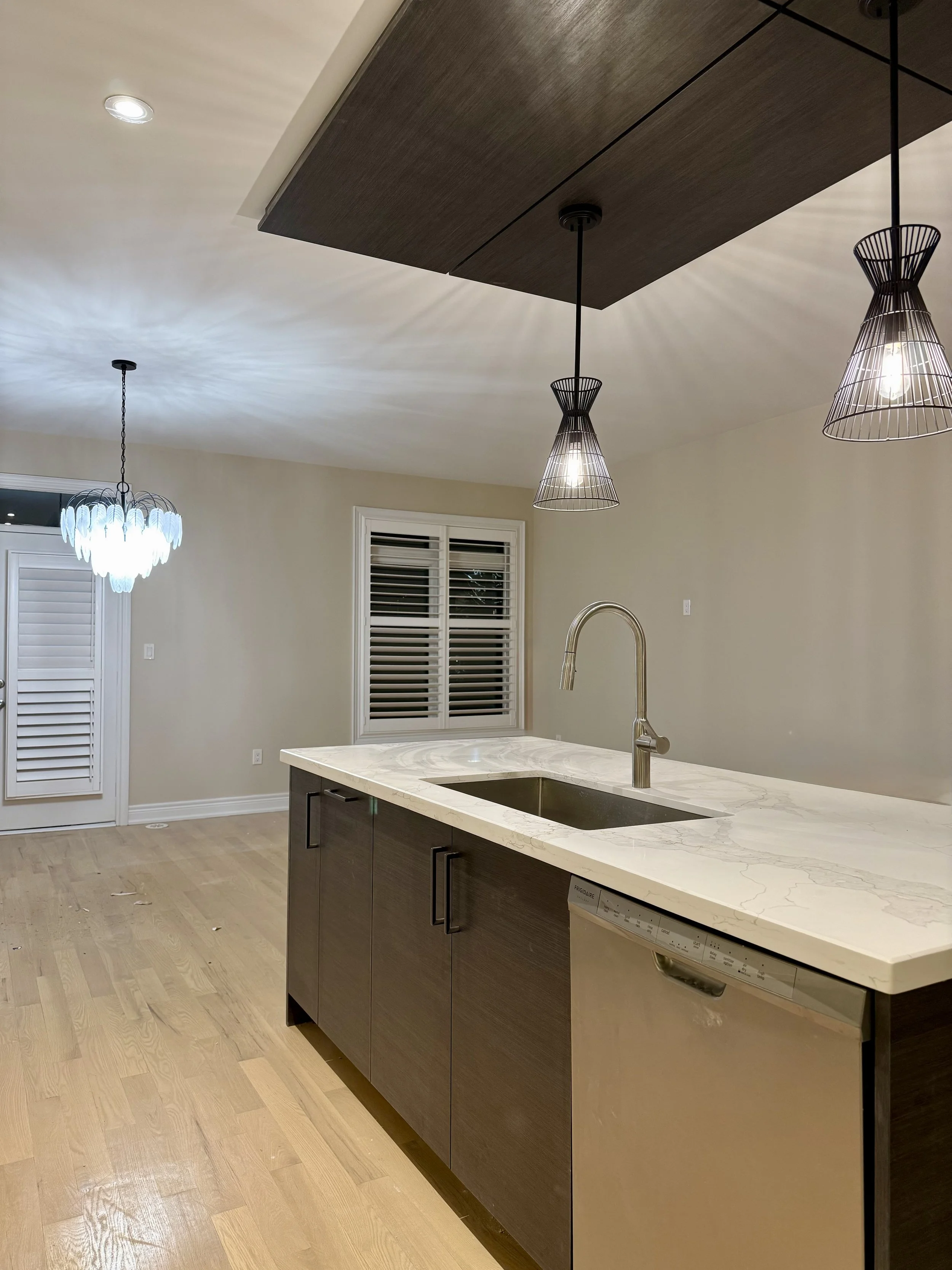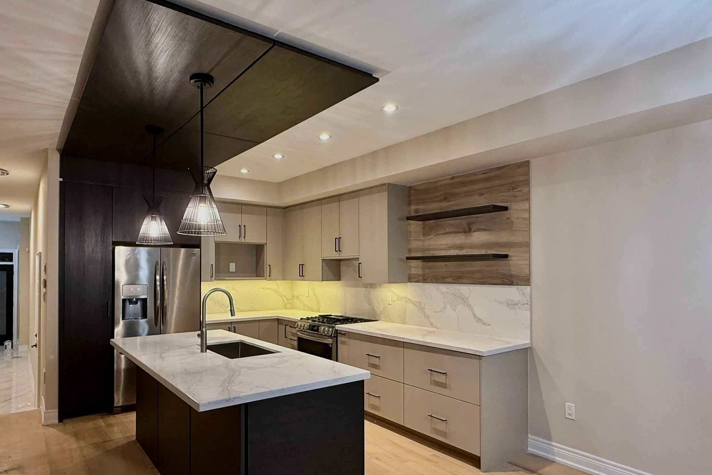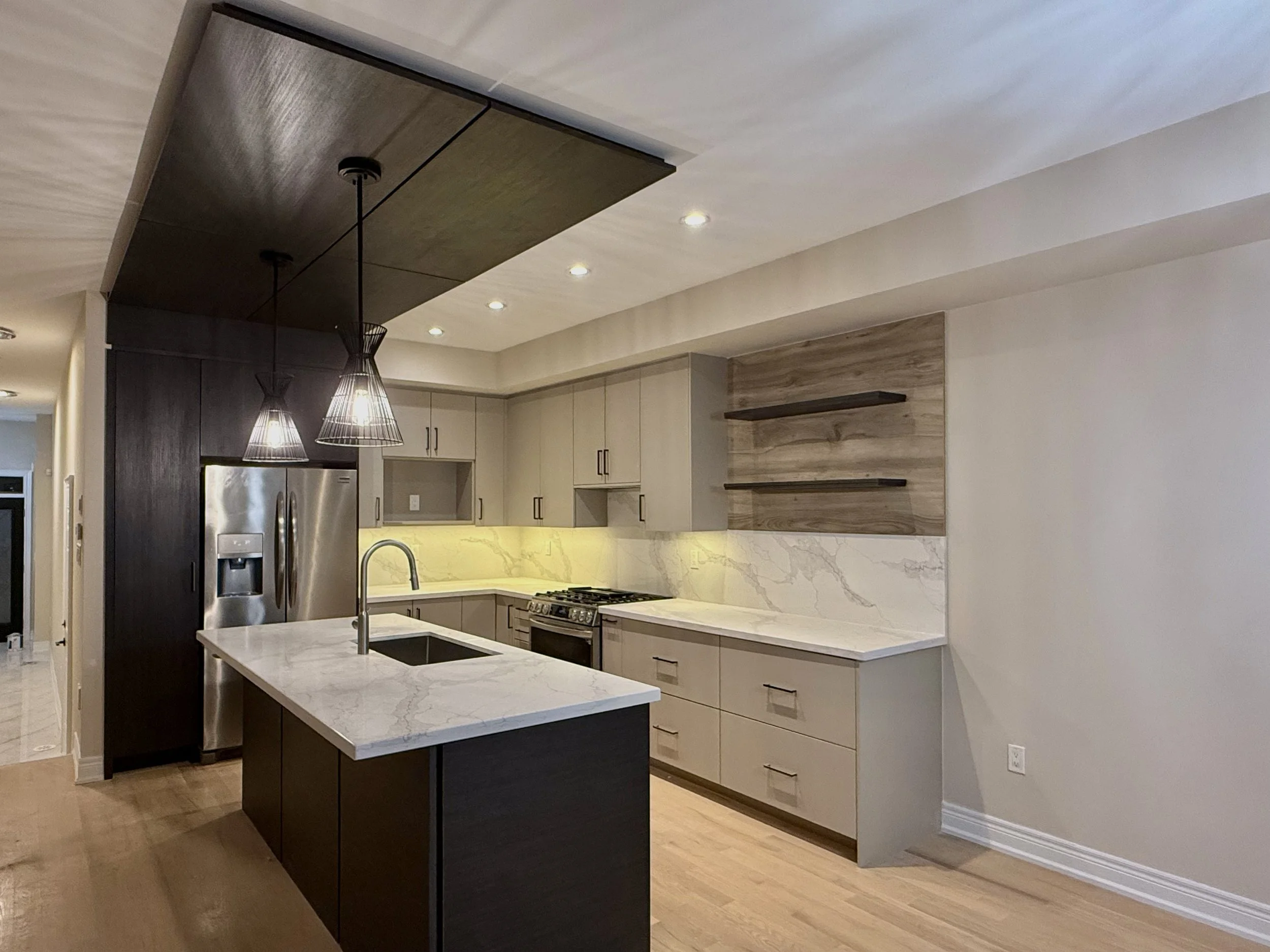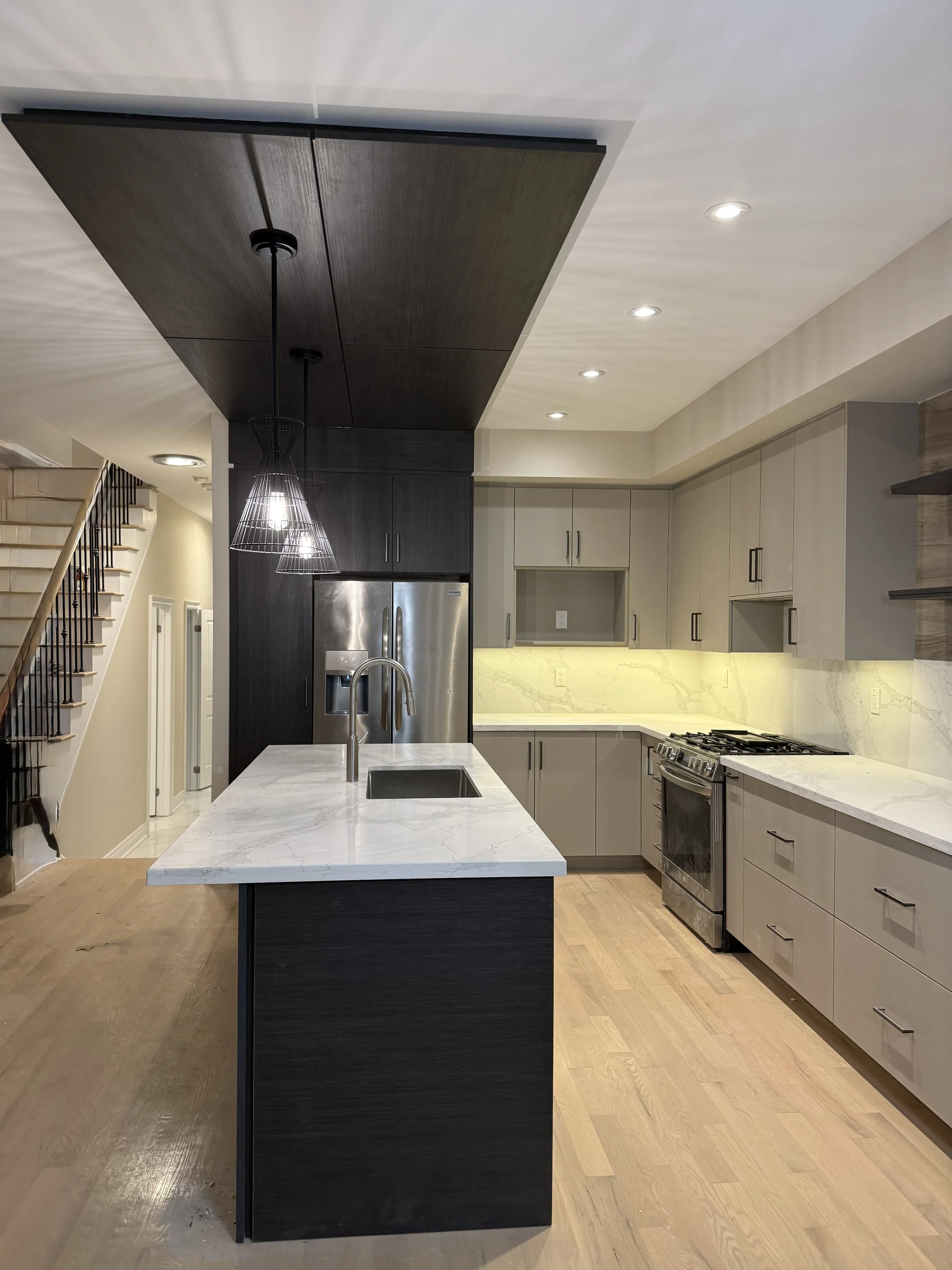 This full gut renovation transformed a once closed-off kitchen into a warm, modern, open-concept space. A custom floor-to-ceiling accent panel was added behind the fridge to create a striking vertical feature, complemented by open shelving and integrated lighting. Grey cabinetry, a contrasting island, and added storage redefine the layout without altering its footprint. The Timberline Kitchen delivers a refreshed, inviting atmosphere tailored to modern living.